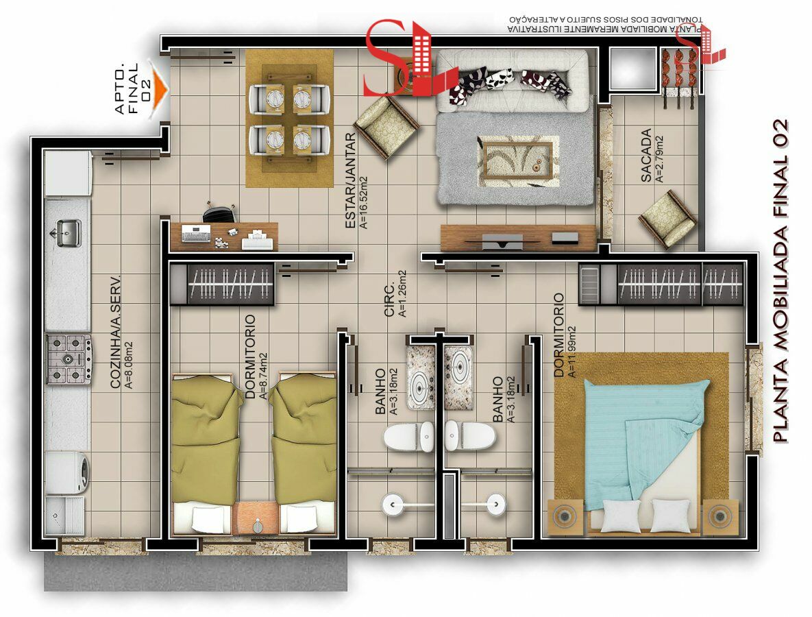 2 Dormitórios, sendo 1 Suíte2 Banheiros1 Vaga1 Cozinha1 Sala de jantar1 Sala de estar1 Área de serviço